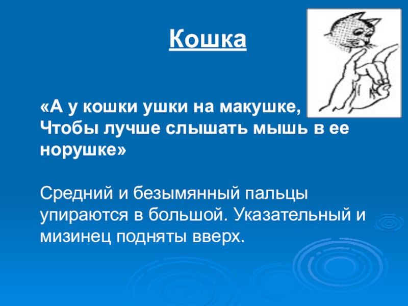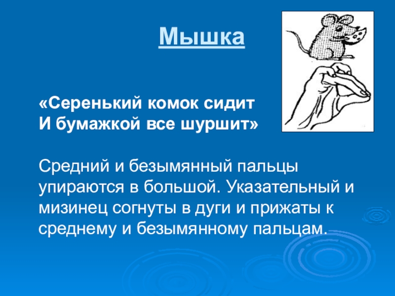 Мышка. Указательный палец и мизинец согнуть, оттянуть назад, подушечки прижать к основанию пальцев (уши). Большой палец прижать к ладони, на него наложить средний и безымянный. Концы пальцев держать на весу, не прижимая к большому пальцу, - это мордочка мышки, которая при диалогах шевелится.