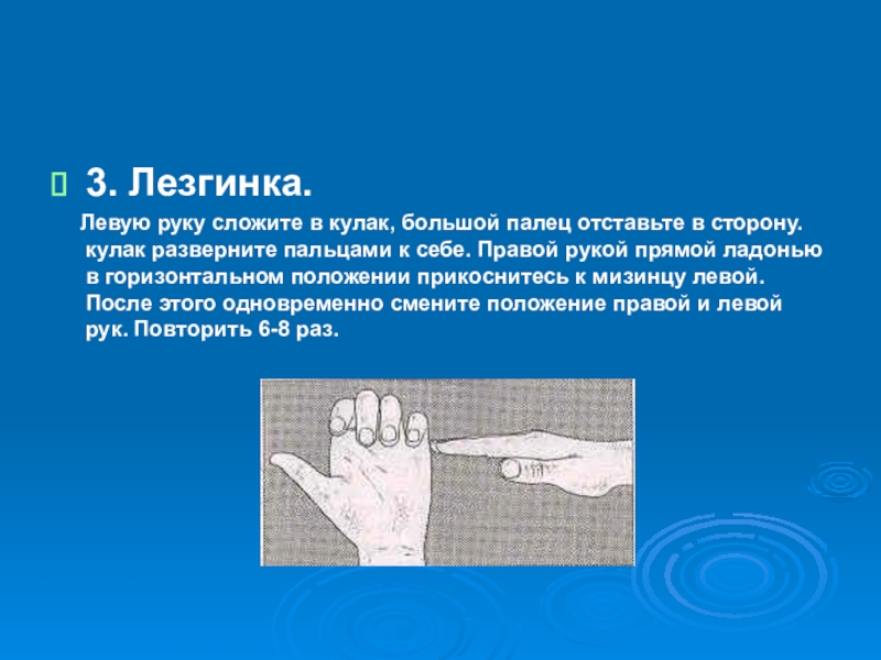 отставьте в сторону. кулак разверните пальцами к себе. Правой рукой прямой ладонью в горизонтальном положении прикоснитесь к мизинцу левой. После этого одновременно смените положение правой и левой рук. Повторить 6-8 раз.