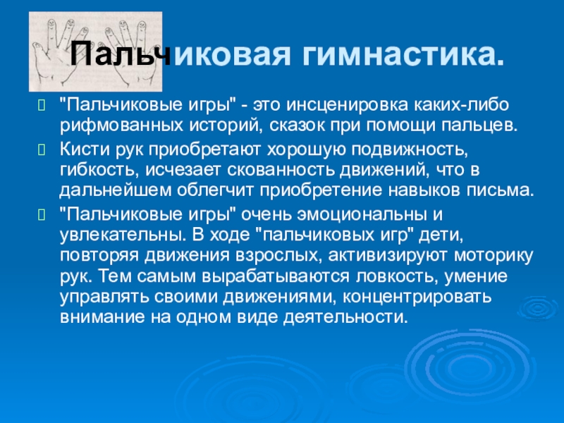 "Пальчиковые игры" очень эмоциональны и увлекательны. В ходе "пальчиковых игр" дети, повторяя движения взрослых, активизируют моторику рук. Тем самым вырабатываются ловкость, умение управлять своими движениями, концентрировать внимание на одном виде деятельности.