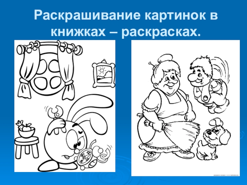 Слайд 26Раскрашивание картинок в книжках – раскрасках.
