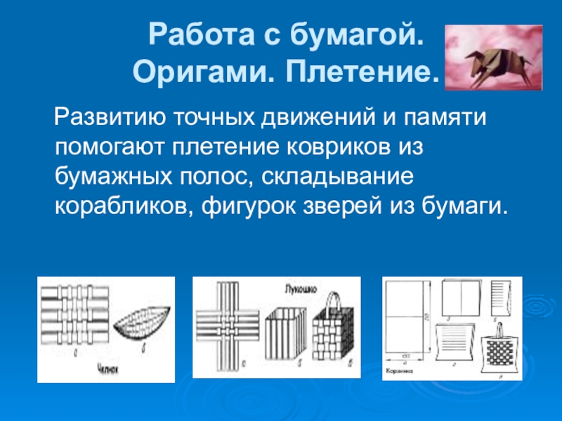 помогают плетение ковриков из бумажных полос, складывание корабликов, фигурок зверей из бумаги.