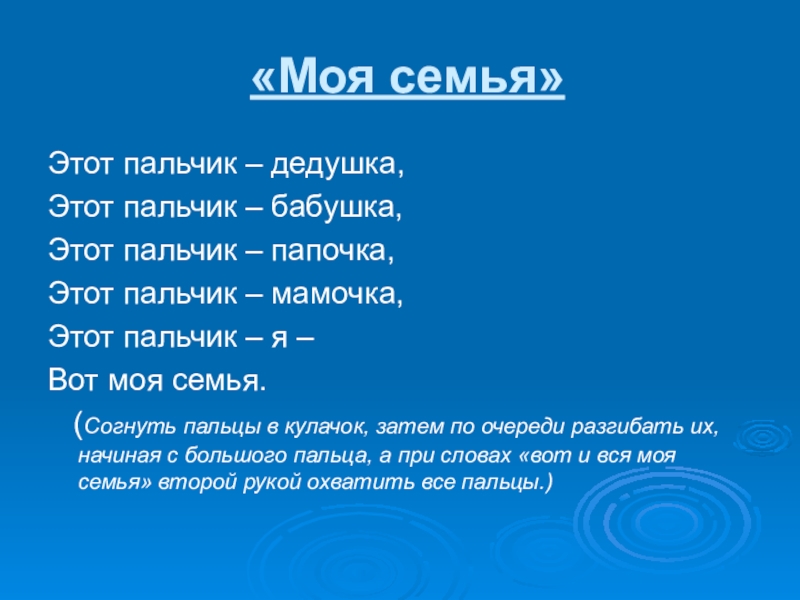 (Согнуть пальцы в кулачок, затем по очереди разгибать их, начиная с большого пальца, а при словах «вот и вся моя семья» второй рукой охватить все пальцы.)