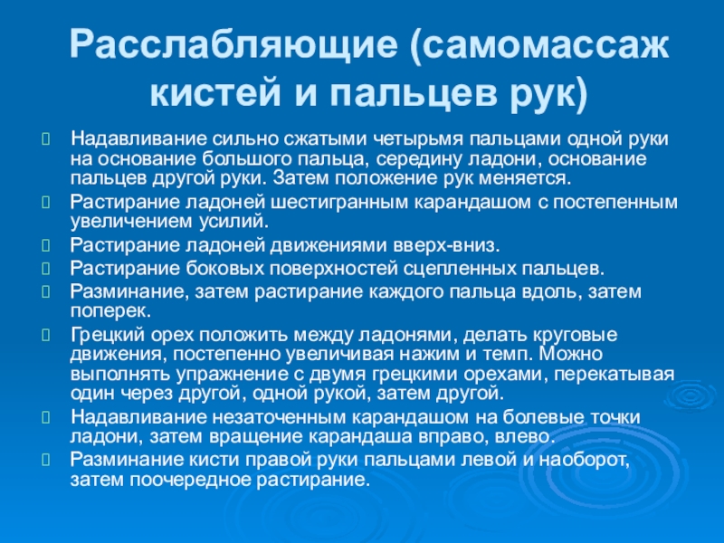 Слайд 32Расслабляющие (самомассаж кистей и пальцев рук)