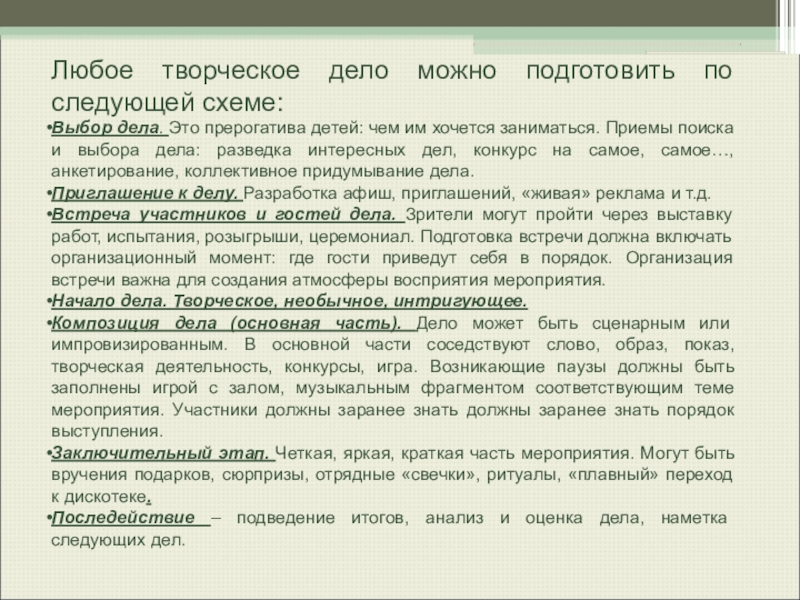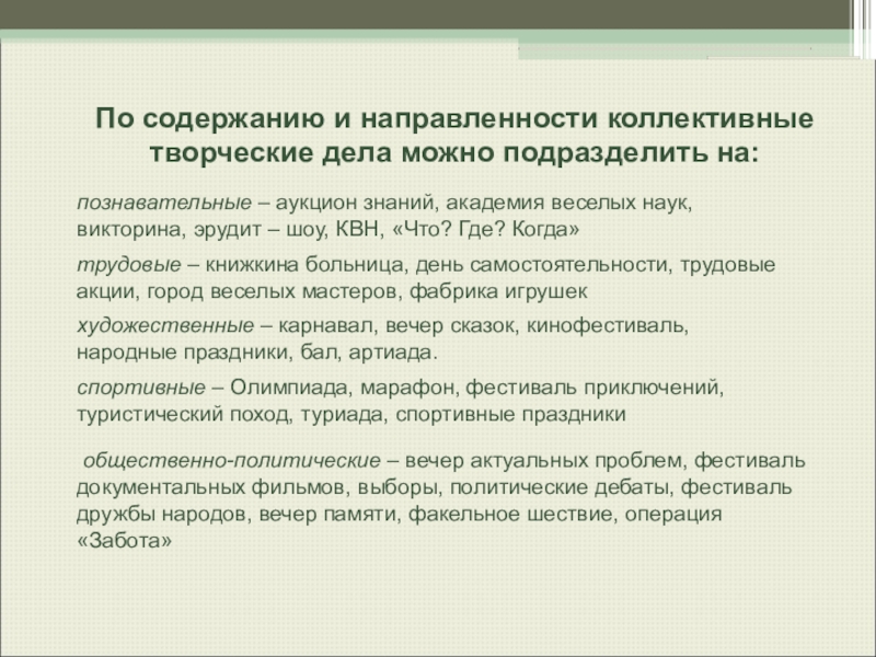 По содержанию и направленности коллективные творческие дела можно подразделить на: