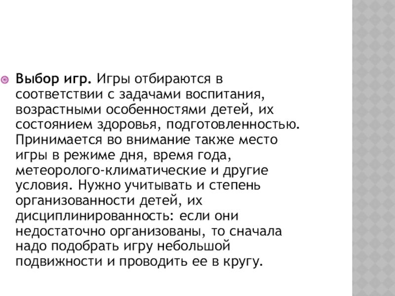 Слайд 4Выбор игр. Игры отбираются в соответствии с задачами воспитания, возрастными особенностями