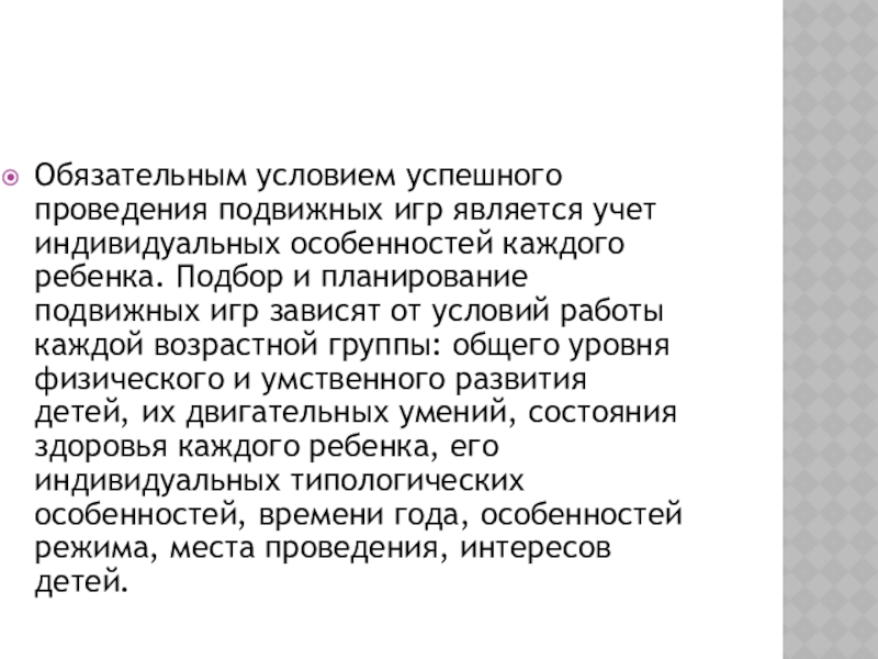 Слайд 3Обязательным условием успешного проведения подвижных игр является учет индивидуальных особенностей каждого