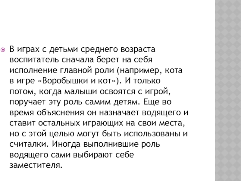 исполнение главной роли (например, кота в игре «Воробышки и кот»). И только потом, когда малыши освоятся с игрой, поручает эту роль самим детям. Еще во время объяснения он назначает водящего и ставит остальных играющих на свои места, но с этой целью могут быть использованы и считалки. Иногда выполнившие роль водящего сами выбирают себе заместителя.