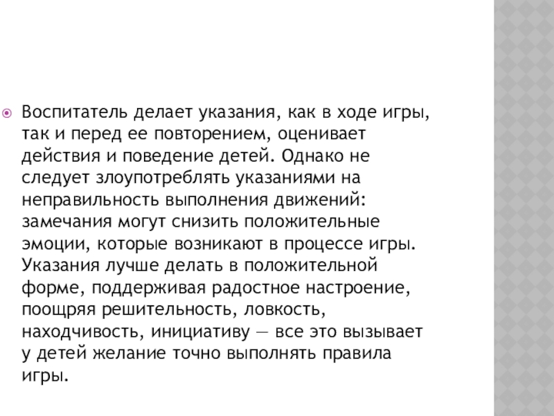 повторением, оценивает действия и поведение детей. Однако не следует злоупотреблять указаниями на неправильность выполнения движений: замечания могут снизить положительные эмоции, которые возникают в процессе игры. Указания лучше делать в положительной форме, поддерживая радостное настроение, поощряя решительность, ловкость, находчивость, инициативу — все это вызывает у детей желание точно выполнять правила игры.