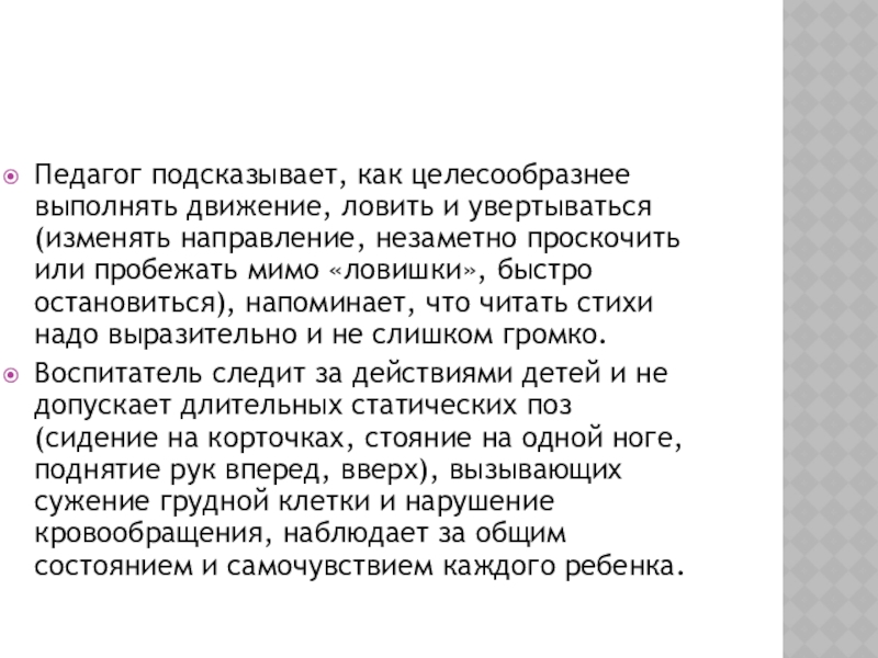 Воспитатель следит за действиями детей и не допускает длительных статических поз (сидение на корточках, стояние на одной ноге, поднятие рук вперед, вверх), вызывающих сужение грудной клетки и нарушение кровообращения, наблюдает за общим состоянием и самочувствием каждого ребенка.