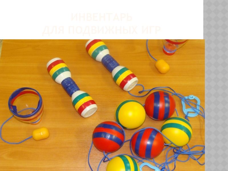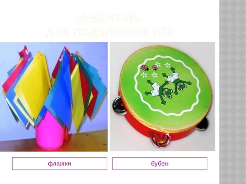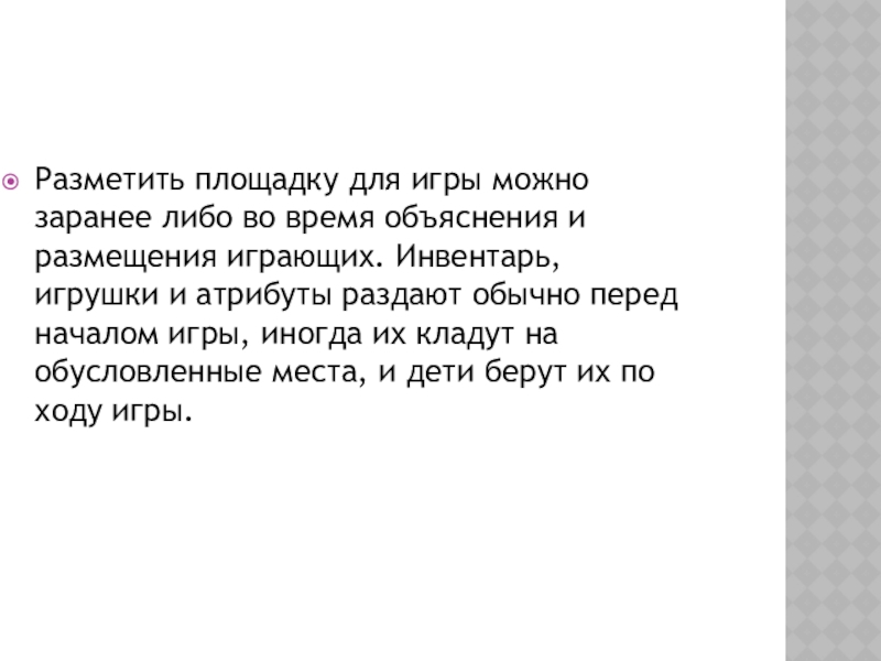 размещения играющих. Инвентарь, игрушки и атрибуты раздают обычно перед началом игры, иногда их кладут на обусловленные места, и дети берут их по ходу игры.