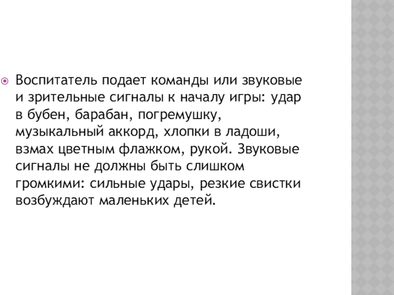 Слайд 16Воспитатель подает команды или звуковые и зрительные сигналы к началу игры: