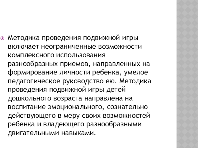 Слайд 2Методика проведения подвижной игры включает неограниченные возможности комплексного использования разнообразных приемов,