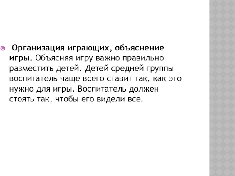 Слайд 7 Организация играющих, объяснение игры. Объясняя игру важно правильно разместить детей.