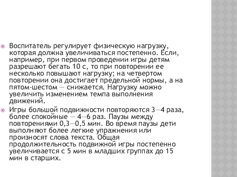 Слайд 20Воспитатель регулирует физическую нагрузку, которая должна увеличиваться постепенно. Если, например, при