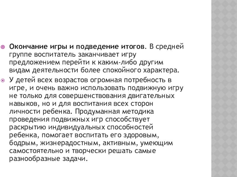 Слайд 21Окончание игры и подведение итогов. В средней группе воспитатель заканчивает игру