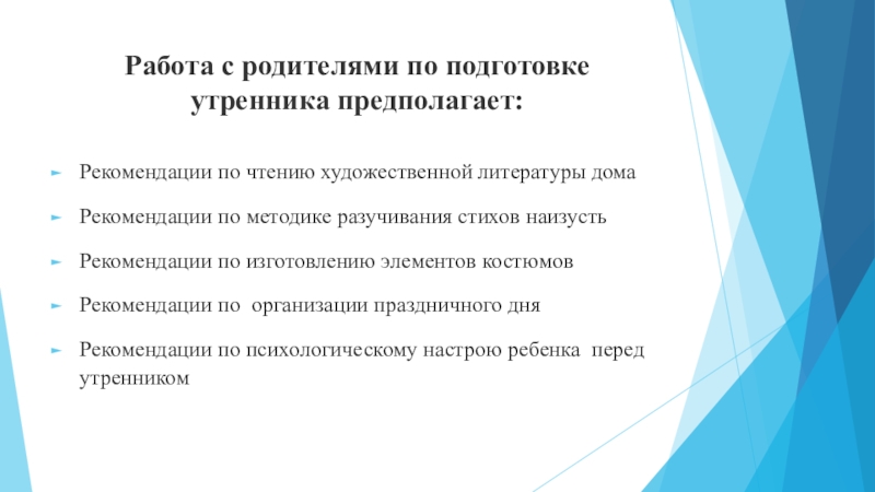 Слайд 16Работа с родителями по подготовке утренника предполагает: