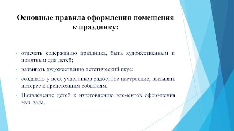 Слайд 19Основные правила оформления помещения к празднику: