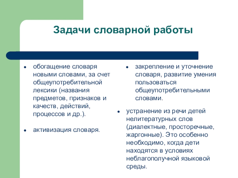 устранение из речи детей нелитературных слов (диалектные, просторечные, жаргонные). Это особенно необходимо, когда дети находятся в условиях неблагополучной языковой среды.