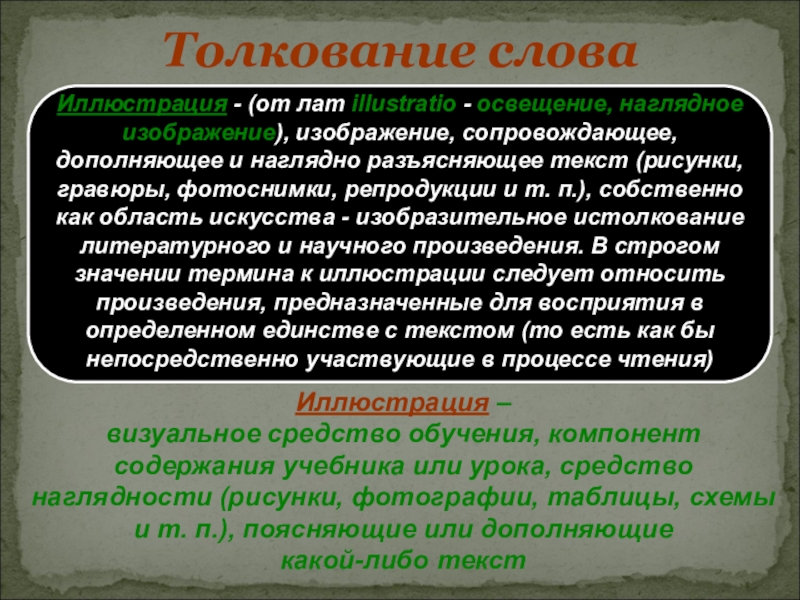 визуальное средство обучения, компонент содержания учебника или урока, средство наглядности (рисунки, фотографии, таблицы, схемы и т. п.), поясняющие или дополняющие