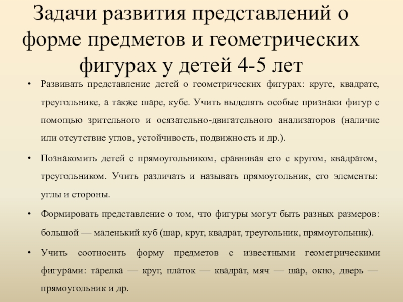 Слайд 8Задачи развития представлений о форме предметов и геометрических фигурах у детей