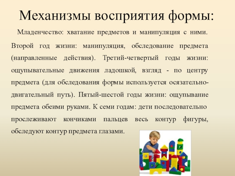 Второй год жизни: манипуляция, обследование предмета (направленные действия). Третий-четвертый годы жизни: ощупывательные движения ладошкой, взгляд - по центру предмета (для обследования формы используется осязательно-двигательный путь). Пятый-шестой годы жизни: ощупывание предмета обеими руками. К семи годам: дети последовательно прослеживают кончиками пальцев весь контур фигуры, обследуют контур предмета глазами.