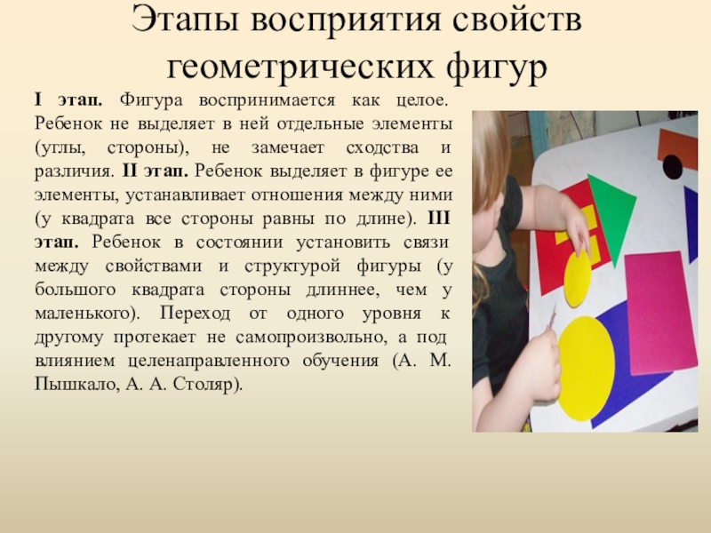 не выделяет в ней отдельные элементы (углы, стороны), не замечает сходства и различия. II этап. Ребенок выделяет в фигуре ее элементы, устанавливает отношения между ними (у квадрата все стороны равны по длине). III этап. Ребенок в состоянии установить связи между свойствами и структурой фигуры (у большого квадрата стороны длиннее, чем у маленького). Переход от одного уровня к другому протекает не самопроизвольно, а под влиянием целенаправленного обучения (А. М. Пышкало, А. А. Столяр).