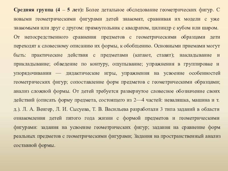 С новыми геометрическими фигурами детей знакомят, сравнивая их модели с уже знакомыми или друг с другом: прямоугольник с квадратом, цилиндр с кубом или шаром. От непосредственного сравнения предметов с геометрическими образцами дети переходят к словесному описанию их формы, к обобщению. Основными приемами могут быть: практические действия с предметами (катают, ставят); накладывание и прикладывание; обведение по контуру, ощупывание; упражнения в группировке и упорядочивании — дидактические игры, упражнения на усвоение особенностей геометрических фигур; сопоставление форм предметов с геометрическими образцами; анализ сложной формы. От детей требуется развернутое словесное обозначение своих действий (описать форму предмета, состоящего из 2—4 частей: неваляшка, машина и т. д.). Л. А. Венгер, Л. И. Сысуева, Т. В. Васильева разработали 3 типа заданий в области ознакомления детей пятого года жизни с формой предметов и геометрическими фигурами: задания на усвоение геометрических фигур; задания на сравнение форм реальных предметов с геометрическими фигурами; Задания на пространственный анализ составной формы.