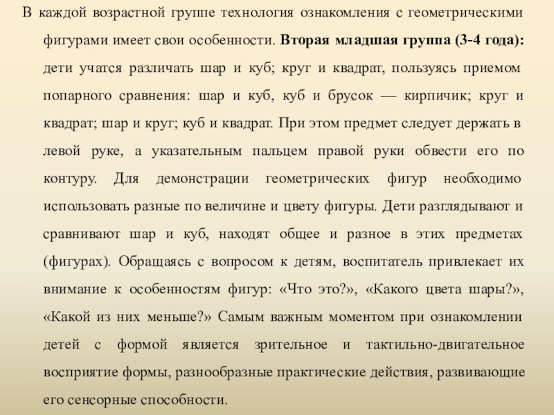 особенности. Вторая младшая группа (3-4 года): дети учатся различать шар и куб; круг и квадрат, пользуясь приемом попарного сравнения: шар и куб, куб и брусок — кирпичик; круг и квадрат; шар и круг; куб и квадрат. При этом предмет следует держать в левой руке, а указательным пальцем правой руки обвести его по контуру. Для демонстрации геометрических фигур необходимо использовать разные по величине и цвету фигуры. Дети разглядывают и сравнивают шар и куб, находят общее и разное в этих предметах (фигурах). Обращаясь с вопросом к детям, воспитатель привлекает их внимание к особенностям фигур: «Что это?», «Какого цвета шары?», «Какой из них меньше?» Самым важным моментом при ознакомлении детей с формой является зрительное и тактильно-двигательное восприятие формы, разнообразные практические действия, развивающие его сенсорные способности.