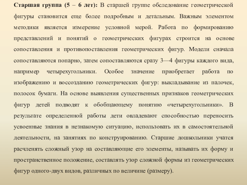 фигуры становится еще более подробным и детальным. Важным элементом методики является измерение условной мерой. Работа по формированию представлений и понятий о геометрических фигурах строится на основе сопоставления и противопоставления геометрических фигур. Модели сначала сопоставляются попарно, затем сопоставляются сразу 3—4 фигуры каждого вида, например четырехугольники. Особое значение приобретает работа по изображению и воссозданию геометрических фигур: выкладывание из палочек, полосок бумаги. На основе выявления существенных признаков геометрических фигур детей подводят к обобщающему понятию «четырехугольники». В результате определенной работы дети овладевают способностью переносить усвоенные знания в незнакомую ситуацию, использовать их в самостоятельной деятельности, на занятиях по конструированию. Старшие дошкольники учатся расчленять сложный узор на составляющие его элементы, называть их форму и пространственное положение, составлять узор сложной формы из геометрических фигур одного-двух видов, различных по величине (размеру).