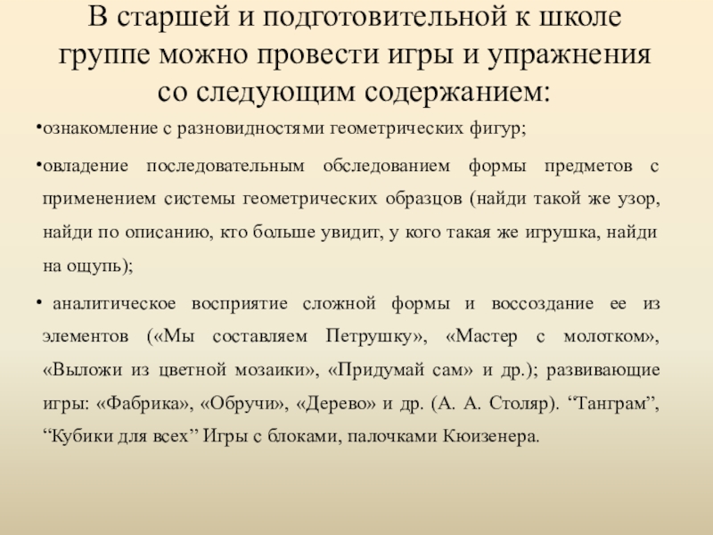 аналитическое восприятие сложной формы и воссоздание ее из элементов («Мы составляем Петрушку», «Мастер с молотком», «Выложи из цветной мозаики», «Придумай сам» и др.); развивающие игры: «Фабрика», «Обручи», «Дерево» и др. (А. А. Столяр). “Танграм”, “Кубики для всех” Игры с блоками, палочками Кюизенера.