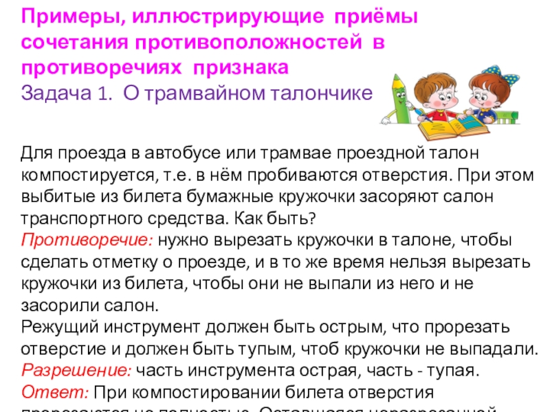 Противоречие: нужно вырезать кружочки в талоне, чтобы сделать отметку о проезде, и в то же время нельзя вырезать кружочки из билета, чтобы они не выпали из него и не засорили салон.
