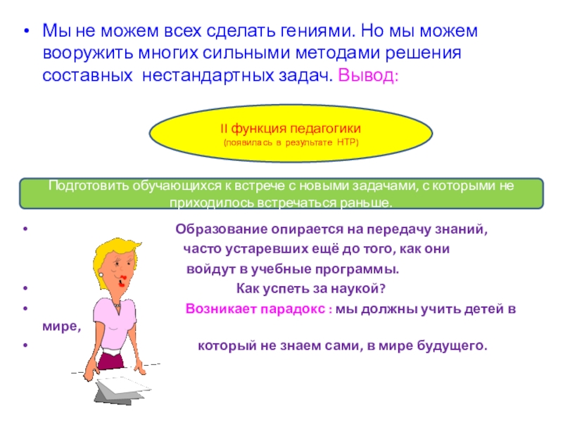 Главное надо учить не конкретным знаниям, а способам быстрого и эффективного усвоения знаний («умению учиться»)
