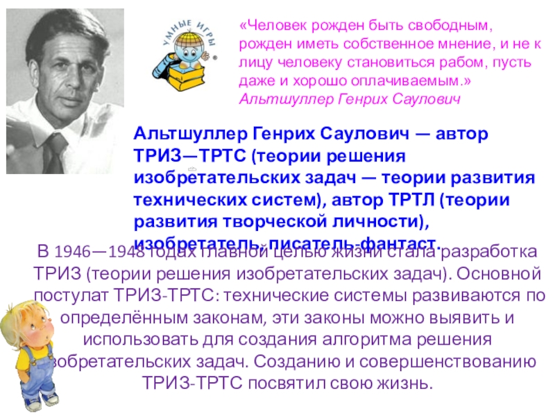 Альтшуллер Генрих Саулович — автор ТРИЗ—ТРТС (теории решения изобретательских задач — теории развития технических систем), автор ТРТЛ (теории развития творческой личности), изобретатель, писатель-фантаст.