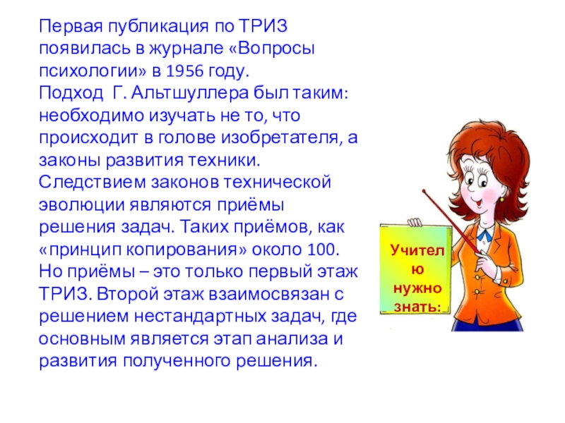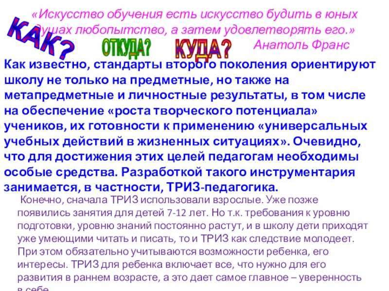 Как известно, стандарты второго поколения ориентируют школу не только на предметные, но также на метапредметные и личностные результаты, в том числе на обеспечение «роста творческого потенциала» учеников, их готовности к применению «универсальных учебных действий в жизненных ситуациях». Очевидно, что для достижения этих целей педагогам необходимы особые средства. Разработкой такого инструментария занимается, в частности, ТРИЗ-педагогика.