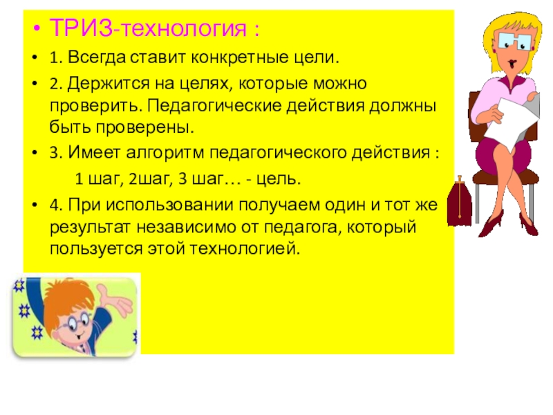 Конечно, сначала ТРИЗ использовали взрослые. Уже позже появились занятия для детей 7-12 лет. Но т.к. требования к уровню подготовки, уровню знаний постоянно растут, и в школу дети приходят уже умеющими читать и писать, то и ТРИЗ как следствие молодеет. При этом обязательно учитываются возможности ребенка, его интересы. ТРИЗ для ребенка включает все, что нужно для его развития в раннем возрасте, а это дает самое главное – уверенность в себе.