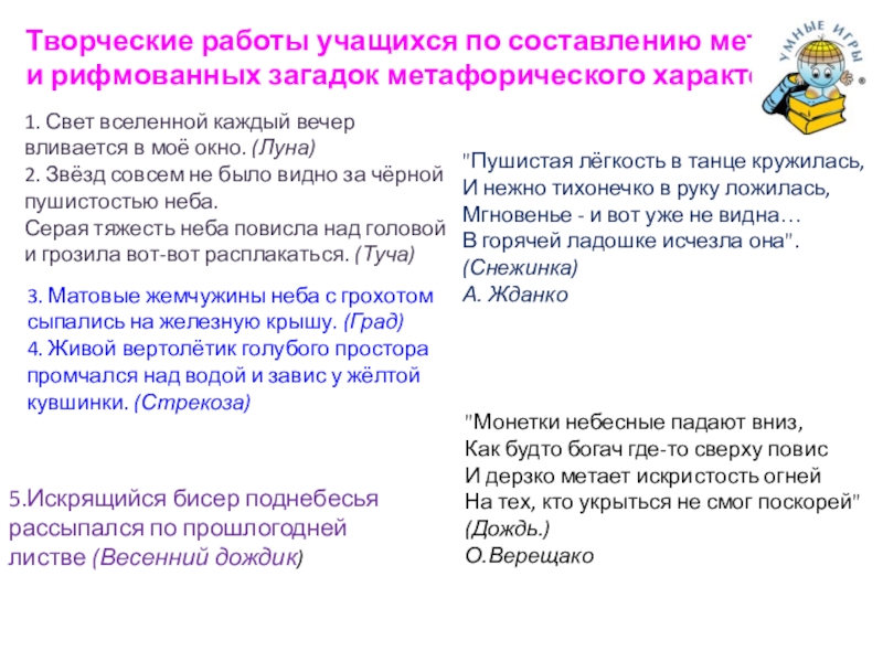 3. Матовые жемчужины неба с грохотом сыпались на железную крышу. (Град)