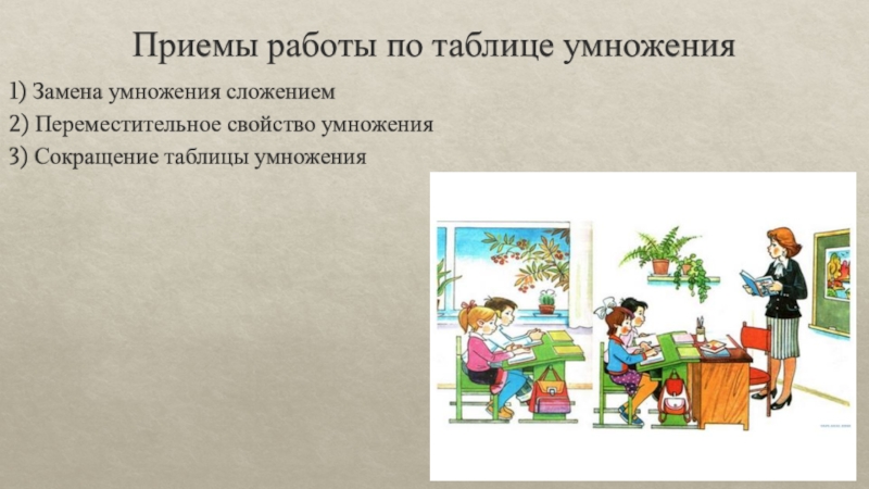 Приемы работы по таблице умножения1) Замена умножения сложением2) Переместительное свойство умножения3) Сокращение таблицы умножения
