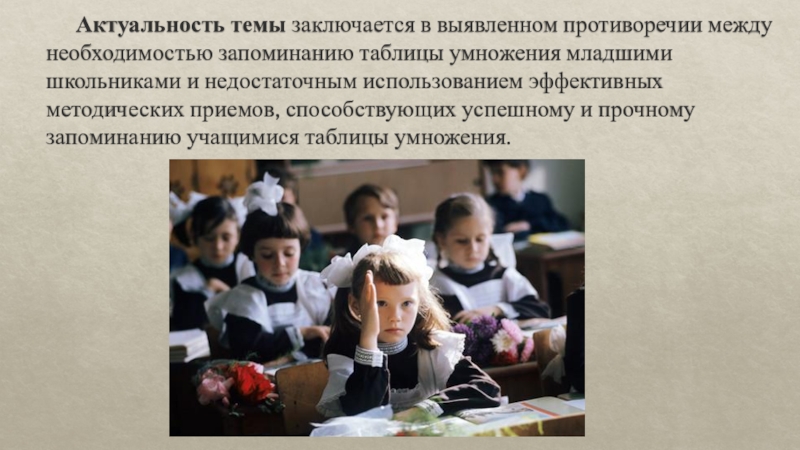 Слайд 2 Актуальность темы заключается в выявленном противоречии между необходимостью запоминанию таблицы умножения