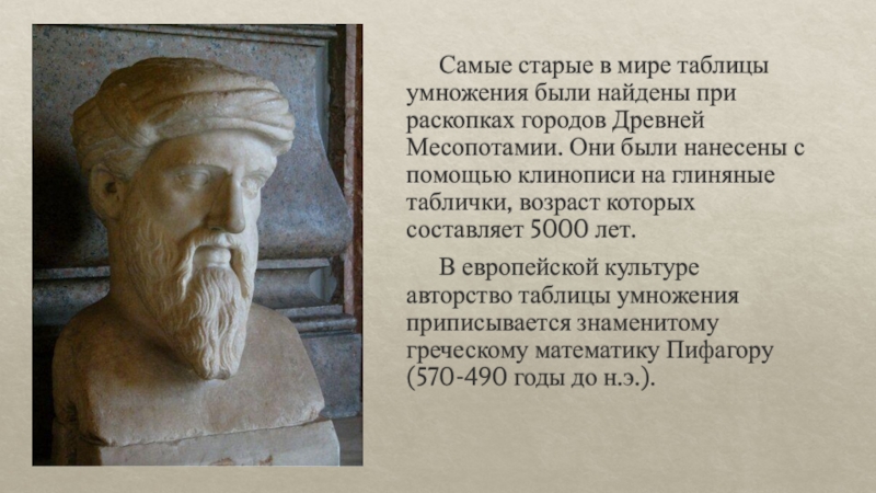 В европейской культуре авторство таблицы умножения приписывается знаменитому греческому математику Пифагору (570-490 годы до н.э.).