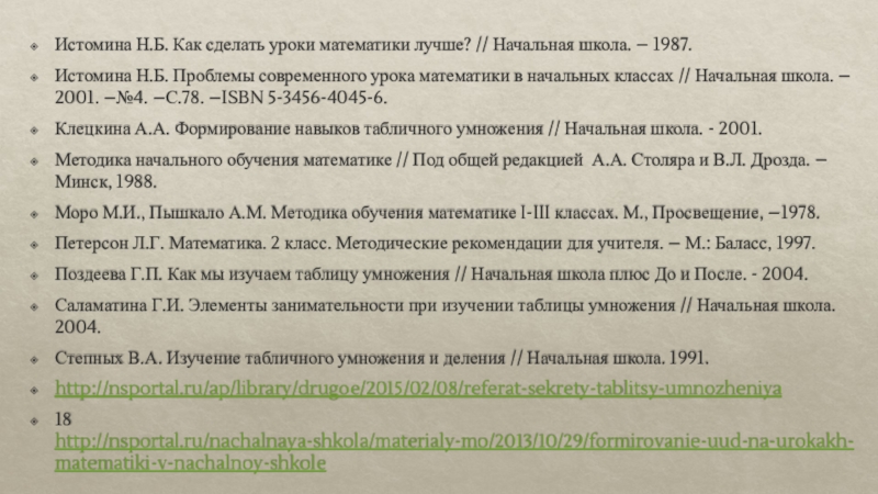 Истомина Н.Б. Как сделать уроки математики лучше? // Начальная школа. – 1987. Истомина Н.Б. Проблемы современного урока