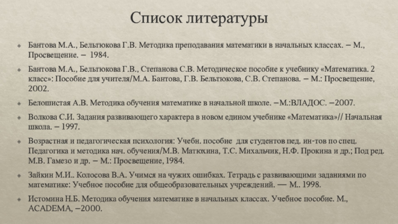 Список литературыБантова М.А., Бельтюкова Г.В. Методика преподавания математики в начальных классах. – М., Просвещение. – 1984.Бантова М.А.,