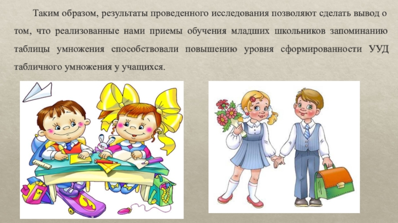 реализованные нами приемы обучения младших школьников запоминанию таблицы умножения способствовали повышению уровня сформированности УУД табличного умножения у учащихся.