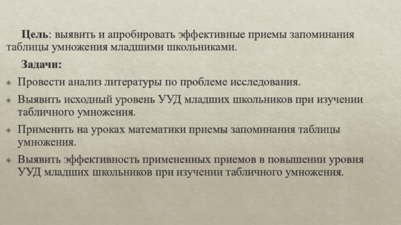 Цель: выявить и апробировать эффективные приемы запоминания таблицы умножения младшими школьниками.	Задачи:Провести анализ литературы по проблеме исследования.Выявить исходный