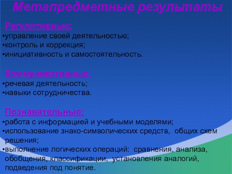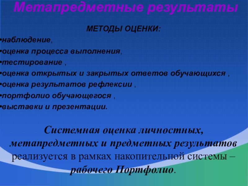 Системная оценка личностных, метапредметных и предметных результатов реализуется в рамках накопительной системы – рабочего Портфолио.