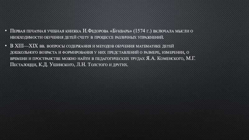 В XIII—XIX вв. вопросы содержания и методов обучения математике детей дошкольного возраста и формирования у них представлений о размере, измерении, о времени и пространстве можно найти в педагогических трудах Я.А. Коменского, М.Г. Песталоцци, К.Д. Ушинского, Л.Н. Толстого и других.