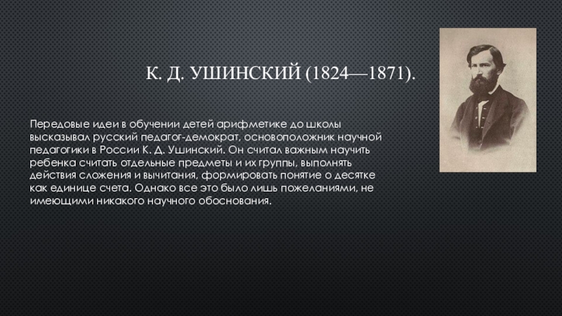 высказывал русский педагог-демократ, основоположник научной педагогики в России К. Д. Ушинский. Он считал важным научить ребенка считать отдельные предметы и их группы, выполнять действия сложения и вычитания, формировать понятие о десятке как единице счета. Однако все это было лишь пожеланиями, не имеющими никакого научного обоснования.