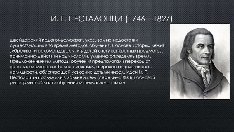 то время методов обучения, в основе которых лежит зубрежка, и рекомендовал учить детей счету конкретных предметов, пониманию действий над числами, умению определять время. Предложенные им методы обучения предполагали переход от простых элементов к более сложным, широкое использование наглядности, облегчающей усвоение детьми чисел. Идеи И. Г. Песталоцци послужили в дальнейшем (середина XIX в.) основой реформы в области обучения математике в школе.