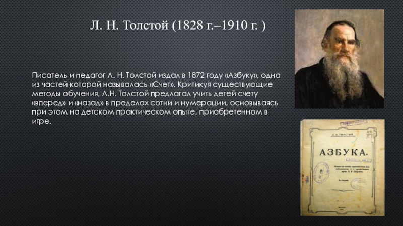 одна из частей которой называлась «Счет». Критикуя существующие методы обучения, Л.Н. Толстой предлагал учить детей счету «вперед» и «назад» в пределах сотни и нумерации, основываясь при этом на детском практическом опыте, приобретенном в игре.