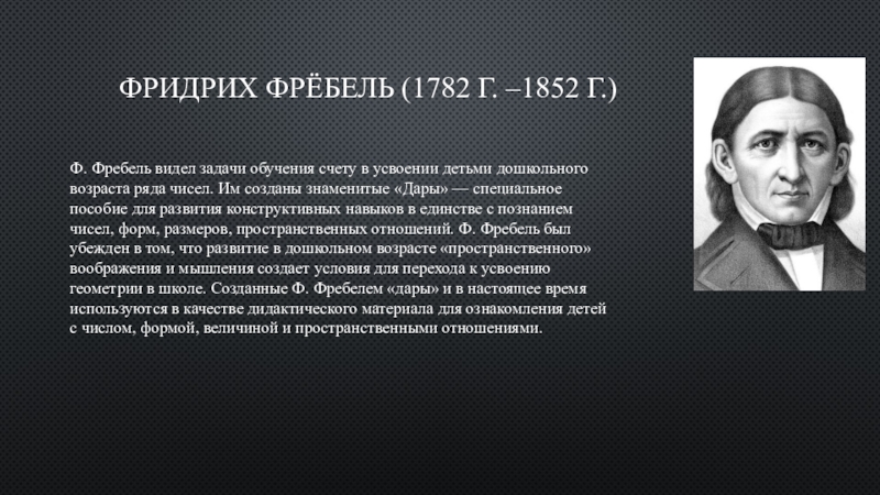 в усвоении детьми дошкольного возраста ряда чисел. Им созданы знаменитые «Дары» — специальное пособие для развития конструктивных навыков в единстве с познанием чисел, форм, размеров, пространственных отношений. Ф. Фребель был убежден в том, что развитие в дошкольном возрасте «пространственного» воображения и мышления создает условия для перехода к усвоению геометрии в школе. Созданные Ф. Фребелем «дары» и в настоящее время используются в качестве дидактического материала для ознакомления детей с числом, формой, величиной и пространственными отношениями.