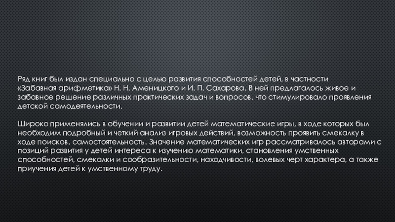 «Забавная арифметика» Н. Н. Аменицкого и И. П. Сахарова. В ней предлагалось живое и забавное решение различных практических задач и вопросов, что стимулировало проявления детской самодеятельности.